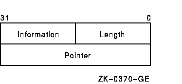 DESCR1: .ASCID /ARGUMENT FOR CALL/ ; String descriptor DESCR2: .ASCID /SECOND ARGUMENT/ ; Another string ; descriptor . . . PUSHAL DESCR1 ; Put address of descriptors PUSHAL DESCR2 ; on the stack CALLS #2,STRNG_PROC ; Call procedure |