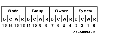 Protection mask to be associated with the created mailbox. The promsk argument is a longword value that is the combined value of the bits set in the protection mask. Cleared bits grant access and set bits deny access to each of the four classes of user: world, group, owner, and system. The following diagram depicts these protection bits.