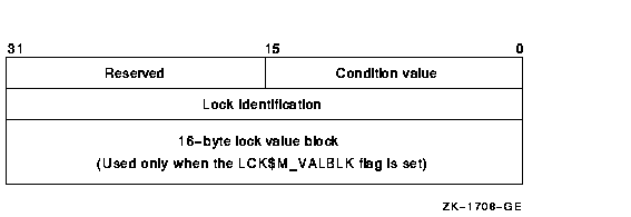 LCK$M_VALBLK | When you specify this flag, the lock status block contains a lock value block. The initial value of the lock value block is zero (0). See the description of the lksb argument for more information. |