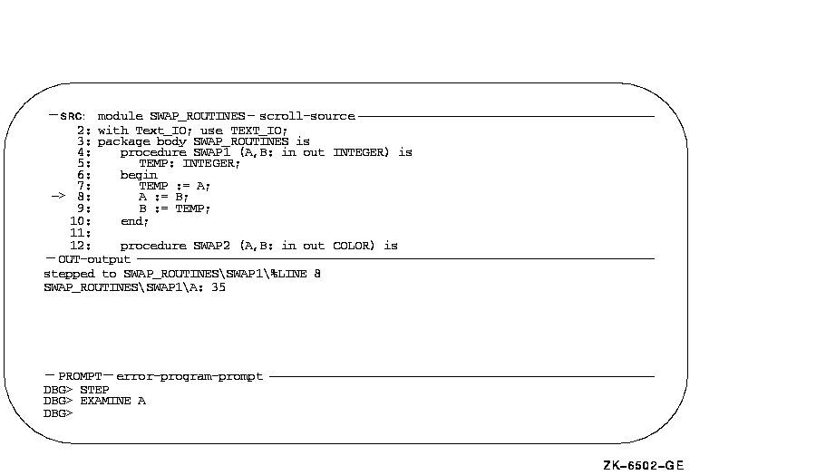 DBG> TYPE 7 module SWAP_ROUTINES 7: TEMP := A; DBG> |