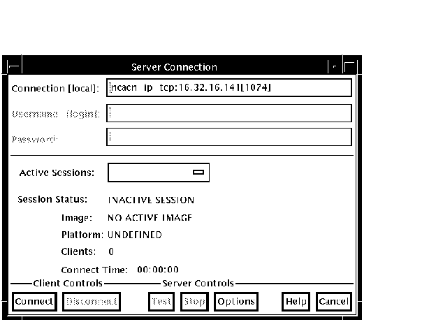 To establish a session from the Motif debug client, click on Server Connection from the File menu. The Server Connection dialog displays, in the Connection list, the default network binding string. This string is based on the last string you entered, or the node on which the client is running. There is not necessarily a server associated with the default binding string. Figure 9-6 shows the Server Connection dialog.