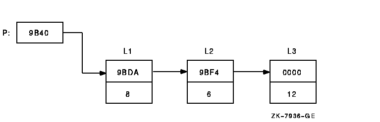 In the next example, the contents-of operator (at sign or period) is used with the current location operator (period) to examine a linked list of three quadword-integer pointer variables (identified as L1, L2, and L3 in the following figure). P is a pointer to the start of the list. The low longword of each pointer variable contains the address of the next variable; the high longword of each variable contains its integer value (8, 6, and 12, respectively).
