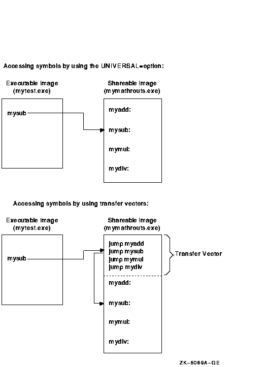 For VAX linking, you declare universal symbols by listing the symbols in a UNIVERSAL= option statement in a linker options file. You can create shareable images that can be modified, recompiled, and relinked without causing the images that were linked against previous versions of the shareable image to be relinked. To provide this upward compatibility, you must create a transfer vector that contains an entry for each universal symbol in the image. For more information about these topics, see Section 4.2.
