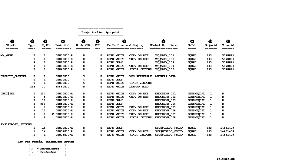 +------------------------+ ! Symbol Cross Reference ! +------------------------+ Symbol (1) Value (2) Defined By (3) Referenced By ... (4) ------ ----- ---------- ----------------- DECC$EXIT 00001FD0-RX DECC$SHR MY_MAIN DECC$GPRINTF 00001710-RX DECC$SHR MY_MAIN DECC$MAIN 000007D0-RX DECC$SHR MY_MAIN MAIN 00010000-R MY_MAIN MYSUB 00000010-RX MY_MATH MY_MAIN MY_SYMBOL 00000050-RX MY_MATH MY_MAIN SYS$IMGSTA 00000340-RX SYS$PUBLIC_VECTORS __MAIN 00010078-R MY_MAIN |