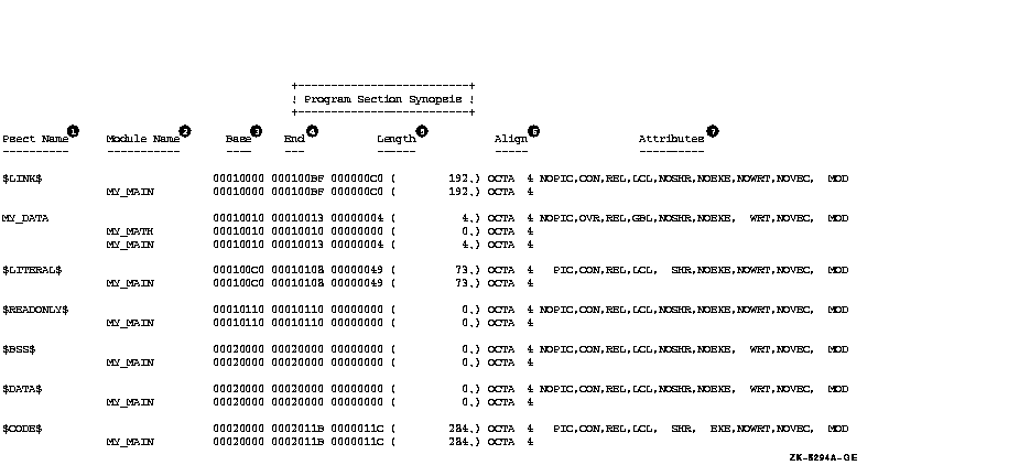 The Program Section Synopsis section lists the program sections that comprise the image, with information about the size of the program section, its starting- and ending-addresses, and its attributes. The Module Name column in this section lists the modules that contribute to each program section. The following example illustrates this format: