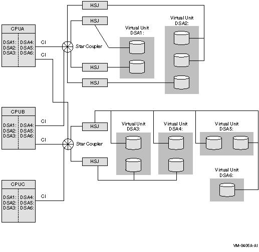 In addition to the hardware components, these figures illustrate how the shadow set virtual unit relates to processors in the system. The hardware used to describe the sample systems, while intended to be representative, is hypothetical; they should be used only for general observations about availability and not as a suggestion for any specific configurations or products.