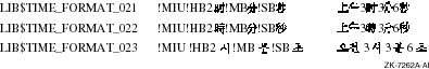 LIB$TIME_FORMAT_021 supports the DEC Hanzi coded character set. LIB$TIME_FORMAT_022 supports the DEC Hanyu coded character set. LIB$TIME_FORMAT_023 supports the DEC Hangul coded character set. |