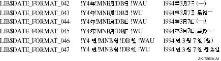 LIB$DATE_FORMAT_042 and LIB$DATE_FORMAT_043 support the DEC Hanzi coded character set. LIB$DATE_FORMAT_044 and LIB$DATE_FORMAT_045 support the DEC Hanyu coded character set. LIB$DATE_FORMAT_046 and LIB$DATE_FORMAT_047 support the DEC Hangul coded character set. |