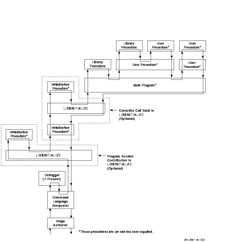 On VAX systems, Figure 18-1 shows the call instruction calling the debugger, if present, and the debugger then directly calling LIB$INITIALIZE and the main program.