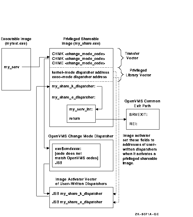 The image activator, when it activates a privileged shareable image, obtains the addresses of the dispatch routines from the PLV and stores these addresses at a location known to the system service dispatcher. When a call to a privileged routine is initiated by a CHME or CHMK instruction, the system service dispatcher attempts to match the code number with a system service code. If there is no match, it transfers control to the location where the image activator has stored the address of your dispatch routines.