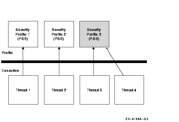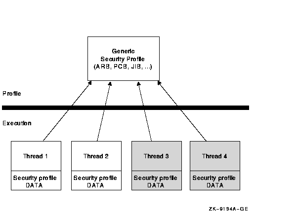 Each thread of execution can share a security profile with other threads or have a thread-specific security profile. Figure 25-8 shows these relationships.