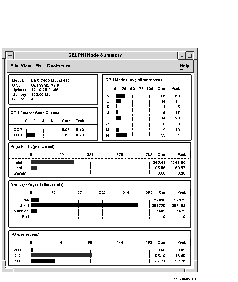 The Node Summary window shown in Figure 3-6 displays a high-level graphic summary of node resource demands on the CPU, memory, and I/O.