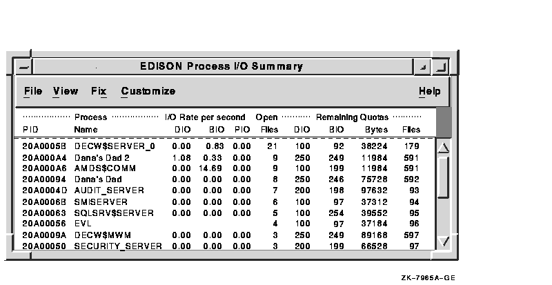 The Process I/O Summary window shown in Figure 3-7 displays summary statistics about process I/O rates and quotas. Use the Process I/O Summary window to display information about I/O issues that might be caused by I/O-intensive users or I/O bottlenecks.