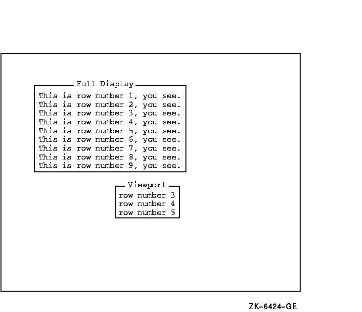 In this Digital Fortran example, the initial virtual display is copied to a second virtual display that has a viewport associated with it. When the second virtual display is pasted, only the portion of the virtual display that falls inside the viewport is visible. This is shown in Figure SMG-8.