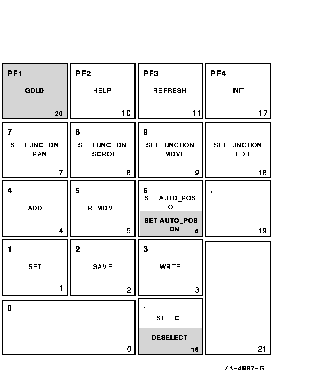 The SET FUNCTION keys, shown in the second row of the keypad, redefine the arrow keys to perform a specified function. You can reset the arrow keys from EDIT to PAN, SCROLL, or MOVE with the SET FUNCTION command. For example, if you press the SET FUNCTION SCROLL key, the up, down, right, and left arrow keys are redefined as SCROLL UP 1, SCROLL DOWN 1, SCROLL RIGHT 1, and SCROLL LEFT 1, respectively. (See the Command Section of Chapter 18 for information about specific commands.)