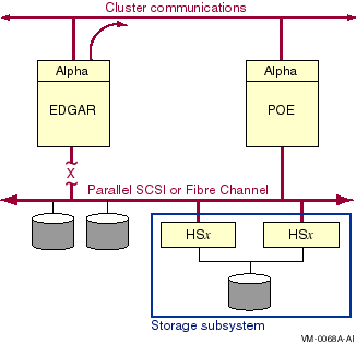 In a multihost SCSI OpenVMS cluster system, you can increase storage availability by configuring the cluster for both types of multipath failover (direct SCSI to direct SCSI and direct SCSI to MSCP served SCSI), as shown in Figure 6-3.