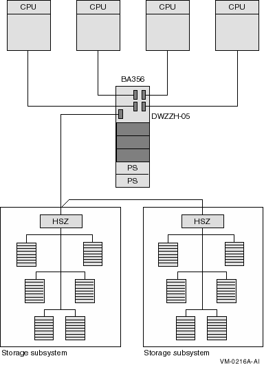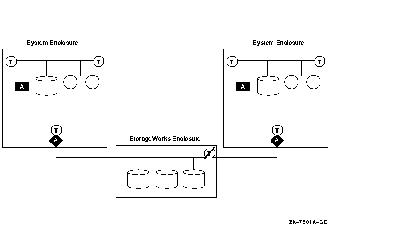 Figure A-4 shows a logical representation of a basic configuration using SCSI adapters and a StorageWorks enclosure. This configuration has the advantage of being relatively simple, while still allowing the use of tapes, floppies, CD-ROMs, and disks with nonshared files (for example, page files and swap files) on internal buses. Figure A-5 shows this type of configuration using AlphaServer 1000 systems and a BA350 enclosure.