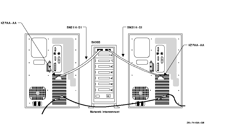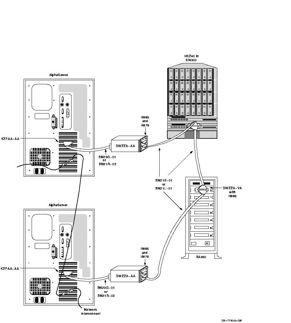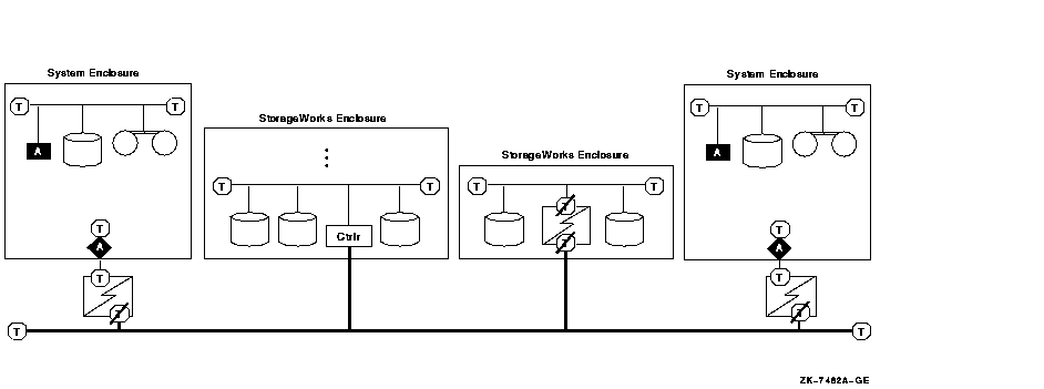 If you need additional enclosures, or if the needs of your site require a greater physical separation between systems, or if you plan to use HSZ controllers, you can use a configuration in which DWZZx converters are placed between systems with single-ended signaling and a differential-cabled SCSI bus.
