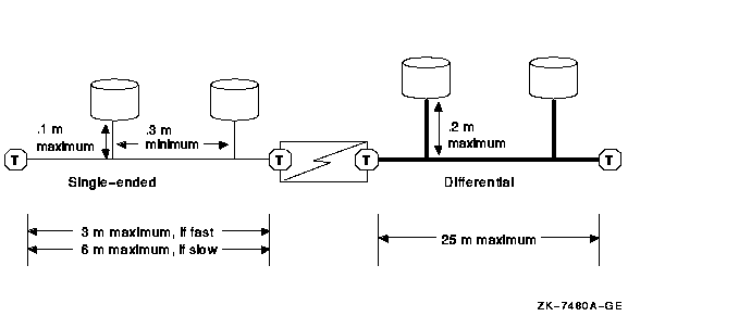 The differential SCSI bus in the configuration shown in Figure A-9 is chained from enclosure to enclosure and is limited to 25 m in length. (The BA356 does not add to the differential SCSI bus length. The differential bus consists only of the BN21W-0B "Y" cables and the BN21K/BN21L cables.) In configurations where this cabling scheme is inconvenient or where it does not provide adequate distance, an alternative radial scheme can be used.