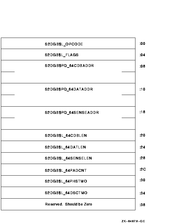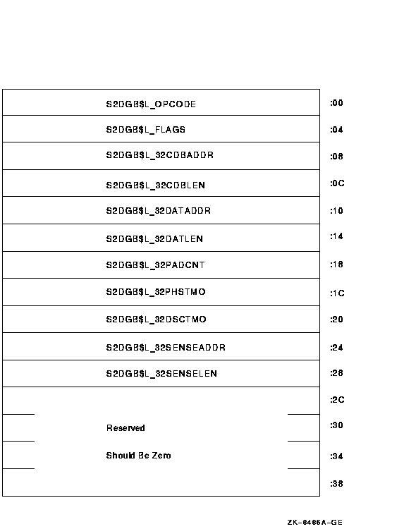 The SCSI Diagnose Buffer (S2DGB) defined in STARLET allows two formats, one for 32-bit addressing and one for 64-bit addressing. The 32-bit format is identical to the one supported on OpenVMS Alpha Version 6.2. Figure 7-1 shows the 32-bit S2DGB format. Figure 7-2 shows the 64-bit S2DGB format.