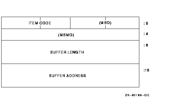 The item_list_3 form of an item list consists of three longwords with the first longword containing a length and item code fields, while the second and third longwords typically contain a buffer address and a return length address field.