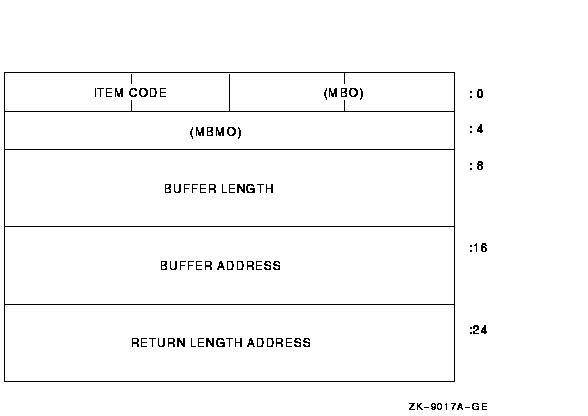 Since two forms of 32-bit item lists exist, two forms of a 64-bit item list are defined. Dubbed item_list_64a and item_list_64b, these item list forms parallel their 32-bit counterparts. Both forms of item list contain the MBO and MBMO fields at offsets 0 and 4 respectively. They also each contain a word-sized item code field, a quadword-sized length field, and a quadword-sized buffer address field. The item_list_64b form of an item list contains an additional quadword for the return length address field. The returned length is 64-bits.