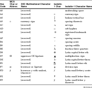Table C-1 contains the DEC Multinational Character Set (MCS). Table C-1 indicates the characters that differ between the two character sets, and Figure C-1 shows the differing characters.