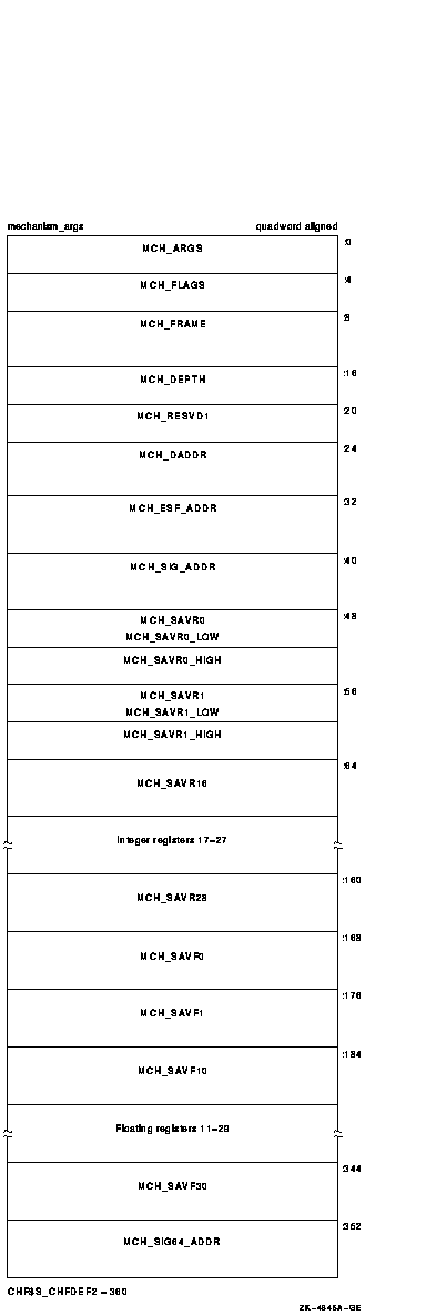 CHF$IH_MCH_SAVRnn | Contents of the saved integer registers at the time of the exception. The following registers are saved: R0, R1, and R16 to R28 inclusive. |
