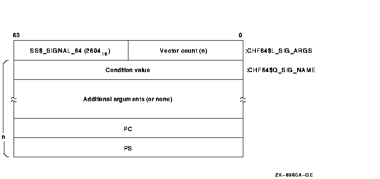 The 64-bit signal array also appears further down the stack. This array comprises all quadwords and is not VAX compatible. It contains the same data as the signal array, and the Figure 2-3 shows the 64-bit signal array for an access violation. The SDA SHOW STACK command uses the CHF64$ symbols listed in the figure to identify the 64-bit signal array on the stack.