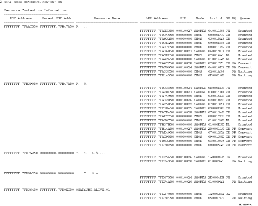 CGMODE Indication of the most restrictive lock mode to which a lock on this resource is waiting to be converted. This does not include the mode for which the lock at the head of the conversion queue is waiting. FGMODE Indication of the full-range grant mode. CSID Cluster system identification number (CSID) and name of the node that owns the resource. RQSEQNM Sequence number of the request. Status The contents of the resource block status field. Resource Dump of the name of this resource, as stored at the end of the RSB. The first two columns are the hexadecimal representation of the name, with the least significant byte represented by the rightmost two digits in the rightmost column. The third column contains the ASCII representation of the name, the least significant byte being represented by the leftmost character in the column. Periods in this column represent values that correspond to nonprinting ASCII characters. Valblk Hexadecimal dump of the 16-byte block value block associated with this resource. Seqnum Sequence number associated with the resource's value block. If the number indicates that the value block is not valid, the words "Not valid" appear to the right of the number. Granted queue List of locks on this resource that have been granted. For each lock in the list, SDA displays the number of the lock and the lock mode in which the lock was granted. Conversion queue List of locks waiting to be converted from one mode to another. For each lock in the list, SDA displays the number of the lock, the mode in which the lock was granted, and the mode to which the lock is to be converted. Waiting queue List of locks waiting to be granted. For each lock in the list, SDA displays the number of the lock and the mode requested for that lock. Length Length in bytes of the resource name. Mode Processor mode of the namespace in which this RSB resides. Owner Owner of the resource. Certain resources, owned by the operating system, list "System" as the owner. Locks owned by a group have the number (in octal) of the owning group in this field.