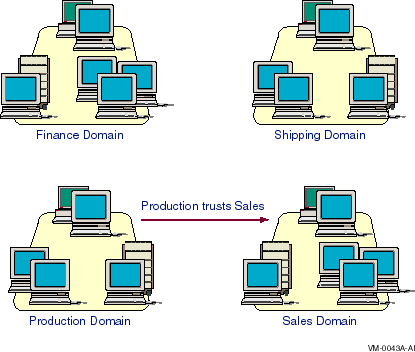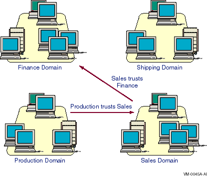 Sales, however, does not trust Production; therefore, resources from Sales cannot be used by users in the Production domain.