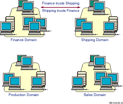 In Figure 2-3, the Finance and Shipping domains trust each other; therefore, accounts in each of these domains can be used in the other. Users in the Finance domain can access resources in the Shipping domain, and users in the Shipping domain can access resources in the Finance domain.