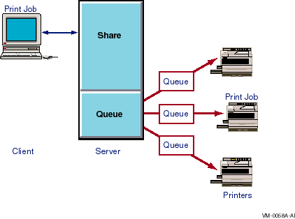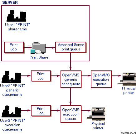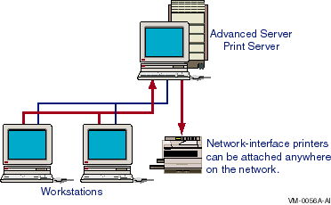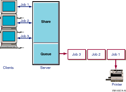 A queue stores print jobs as users submit them. When a printer associated with the queue becomes available, the Advanced Server routes a job to that printer. Printers can be connected directly to the server by a serial or parallel port or directly to the network with a network adapter card. The server's queuing system, providing OpenVMS system information for handling print jobs, mediates between the Advanced Server and the printer so that print jobs can execute while users perform other tasks at their client workstations.