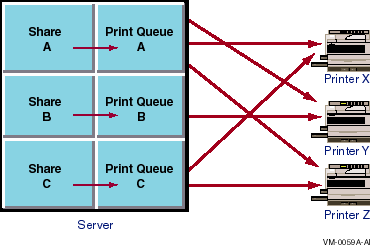 In the configuration shown in Figure 7-5, Queue A sends jobs to Printers X, Y, and Z; Queue B sends jobs only to Printer Y; and Queue C sends jobs to Printers Y and Z. This configuration offers flexibility and convenience both to the administrator who needs to set up different shares and queues for different purposes and to users who need a share and queue that routes jobs to the next available printer.