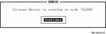 In an OpenVMS cluster, if you attempt to start the License Manager on a node that is not running on the active license server and the license server is active on another member of the cluster, the error message in Figure 4-4, License Server Startup Error Message, appears.
