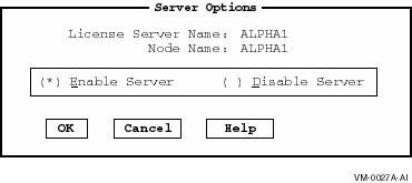 In certain circumstances, if the license server finds no license server state file in the PWRK$LICENSE: directory, the license server disables itself, logs a message in the license server log file and operator console, creates the default license server state file, and remains disabled until the License Manager enables it. For additional information about the license server state file, refer to Section 3.1, License Server State Files.