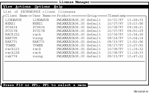 Details about a client are available to the License Manager when the client is assigned a license or when an existing license is verified. If a client does not have a user name as configured by the PATHWORKS Client Configuration utility (PWSETUP), the client appears as <noname>.