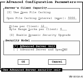 The Configuration Manager allows you to specify whether the server performs dynamic upgrading of PATHWORKS security on files it accesses. When enabled, any file the server accesses whose security is specified entirely according to PATHWORKS V5 for OpenVMS (LAN Manager) security, is upgraded to PATHWORKS V6 for OpenVMS (Advanced Server) security. The mapping file created by the V6 Upgrade utility must be in place for dynamic security upgrade to be performed. Refer to the PATHWORKS for OpenVMS (Advanced Server) Server Migration Guide for more information about the Upgrade utility. By default, dynamic security upgrade is not enabled.