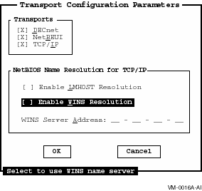 On the Transport Configuration Parameters screen, select Enable WINS Resolution. The check box contains an X when WINS name resolution is enabled.