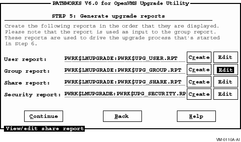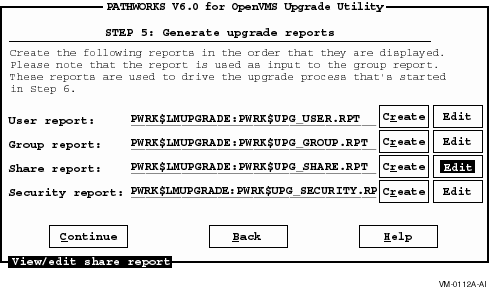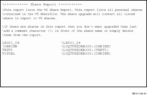The Share report lists the PATHWORKS LAN Manager shares in the LAN Manager share file. If there are shares in the report that you do not want to upgrade, add a backslash (\) in front of the share name, or delete the name from the report. Refer to Appendix B, Resolving Log File Error Messages, in this guide, for more information about how to edit the Share report.