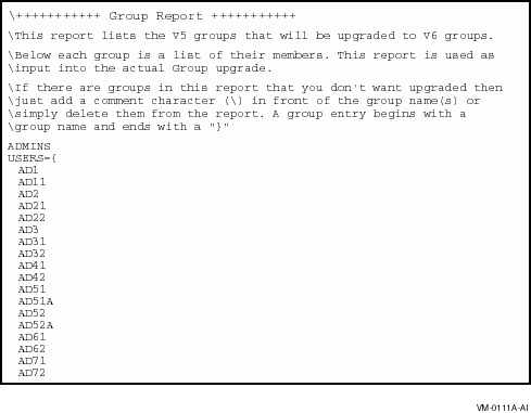 The Group report shows the PATHWORKS LAN Manager groups that will be upgraded to PATHWORKS Advanced Server groups. Below each group is a list of its members. If there are groups in the report that you do not want upgraded, add a backslash (\) in front of the group name and all group members, or delete the names from the report. To delete a member from a group, add a backslash (\) in front of the member name, or delete the member name. Refer to Appendix B, Resolving Log File Error Messages, in this guide for more information about how to edit the Group reports.