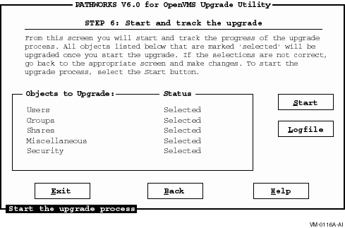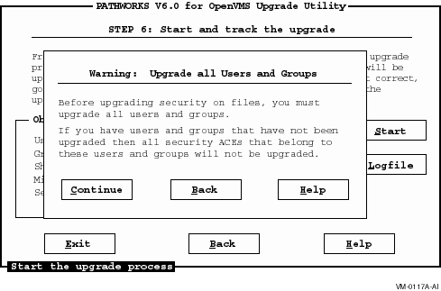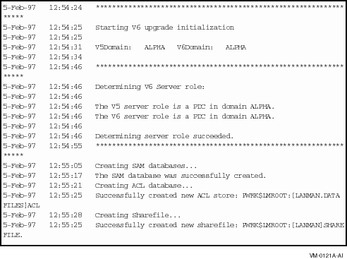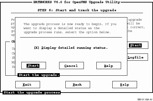 If the upgrade partially or completely fails, the system returns you to the Start and Track the Upgrade screen and prompts you to display the log file. Select the Logfile button to display messages logged during the upgrade. You can also display the log file at the DCL prompt as described in Appendix B, Resolving Log File Error Messages, in this guide.