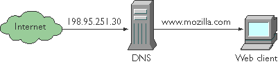 On the Internet, a computer is identified by a number, such as 198.95.251.30. Each computer connected to the Internet has a unique number assigned to it. This number is called a computer's Internet Protocol address, or IP address. To make Internet navigation easier for people, each IP address is also associated with a domain name, such as home.netscape.com, or www.mozilla.com. The words you type into the Location field in Netscape Navigator are automatically translated to IP addresses by a special program called the Domain Name System (or DNS), as shown in Figure 1-3. The DNS is usually maintained by your Internet provider or information systems department.